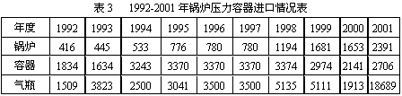 自1992年以来,我国锅炉压力容器进口情况详见表3和图2。
